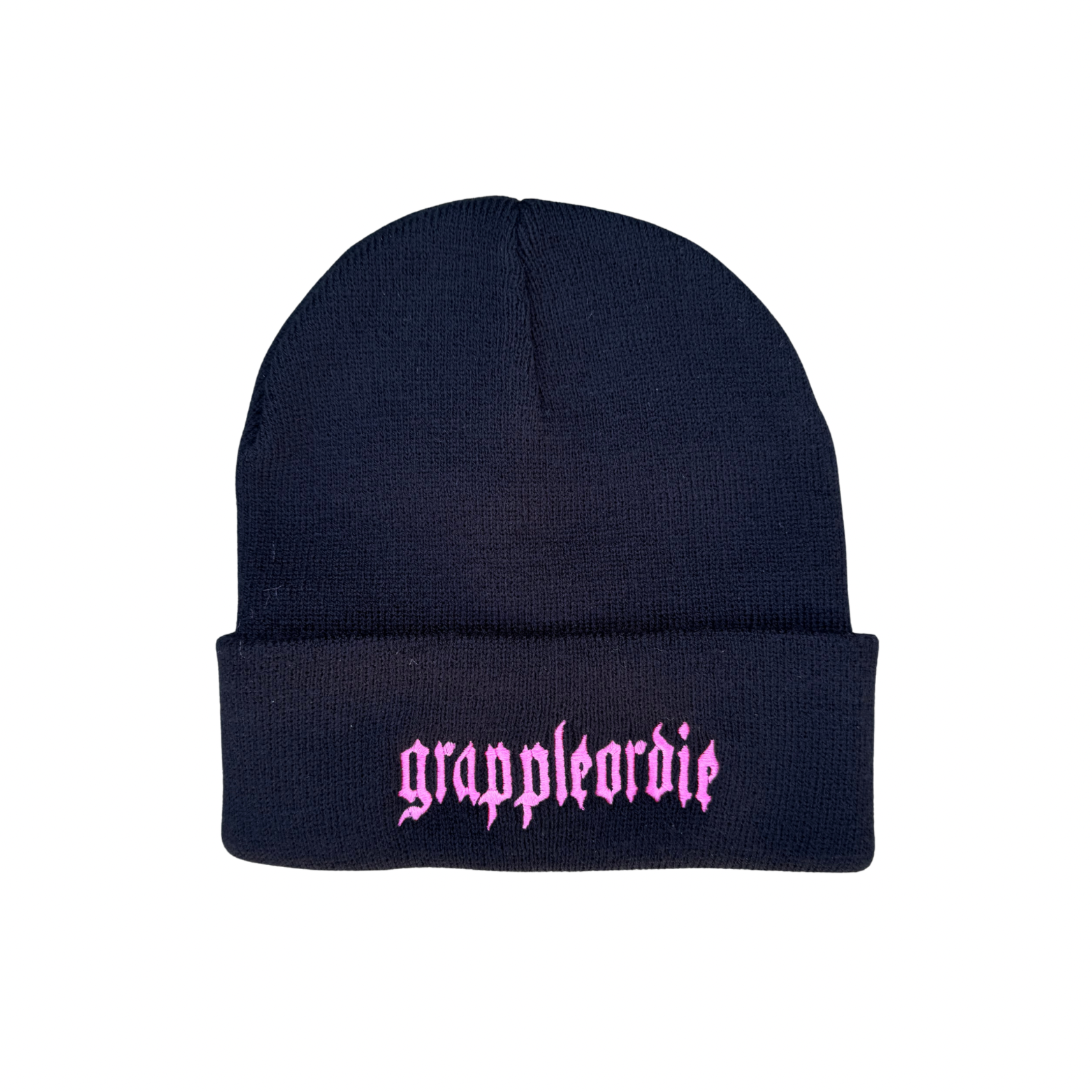 Comfortable Black turnover knit beanie with grappleordie embroidered in pink